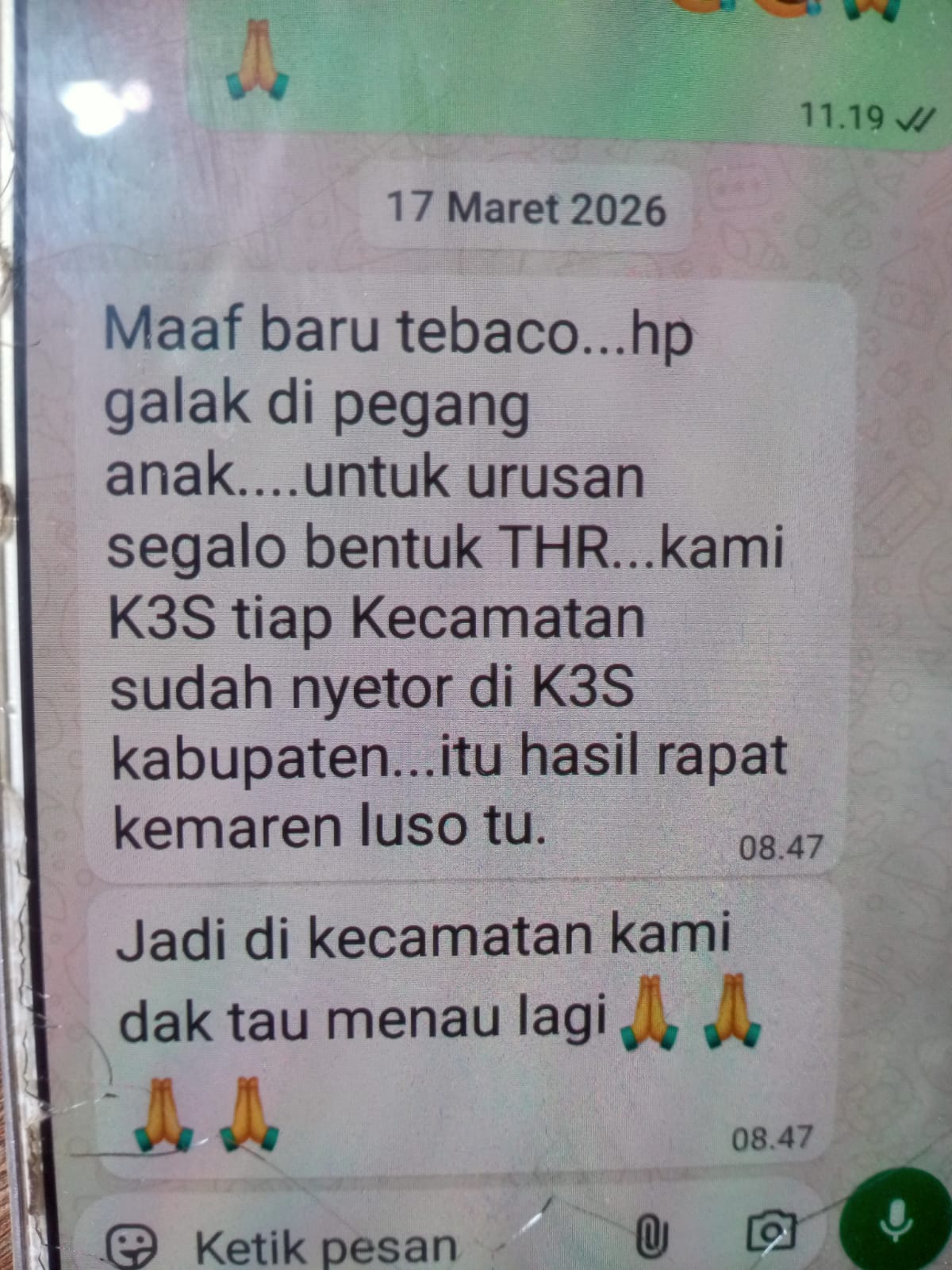 Untuk urusan segalo bentuk THR kami K3S tiap kecamatan sudah nyetor di K3S Kabupaten.Itu hasil rapat kemarin luso.” kata sumber tersebut dalam pesan singkatnya.
